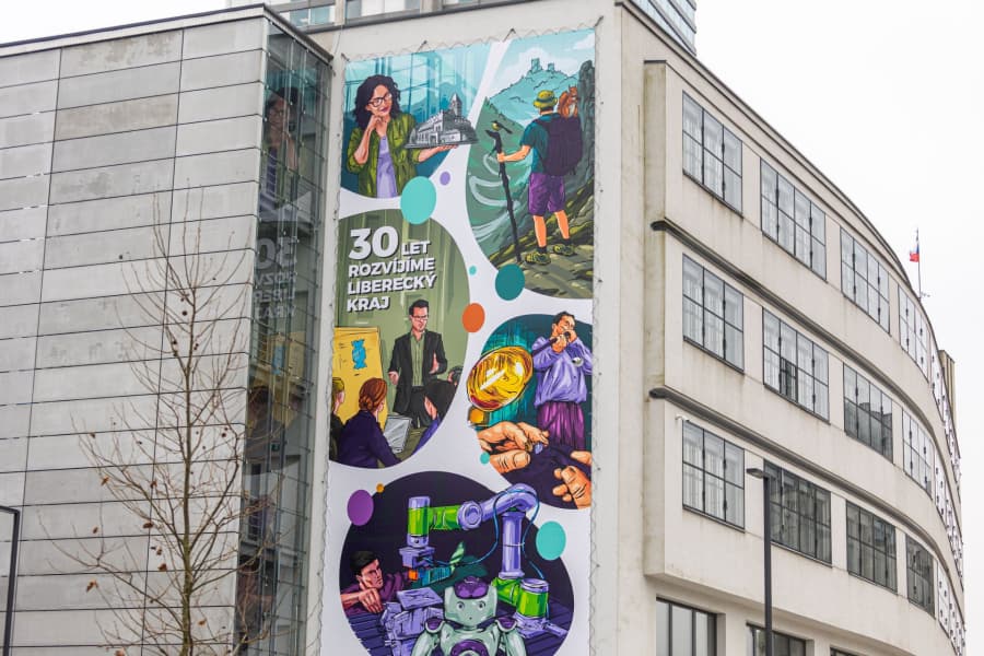 Výroční banner ARR najdete na Evropském domě: více než třicet rozvojových služeb vyjádřených pěti komiksovými bublinami – poslání Agentury regionálního rozvoje koncentrované do plochy šestnáct a půl krát pět celých sedm metrů.